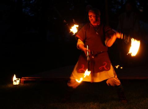 In seiner ca. 15-20 Min. Show zeigt Gaukler Gregorius nicht nur seine Macht über das gefährliche Element Feuer, sondern erzählt noch nebenbei während des Feuerstockdrehens das Gedicht vom „Pappelwappenklapperritter". Oder die Story vom Berufswunsch seines Ur-Ur-Ur etc.-Onkels, Drachen-Einweiser am Mittelalterlichen Flughafen zu Frisinga zu werden.