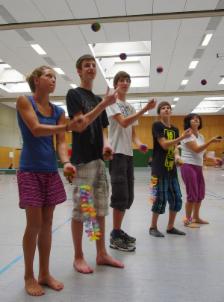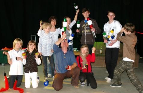Der Jongleur, Feuerkünstler und Clown „GREGOR GRAVITY“ zeigt den Akteuren die verschiedensten Zirkuskünste